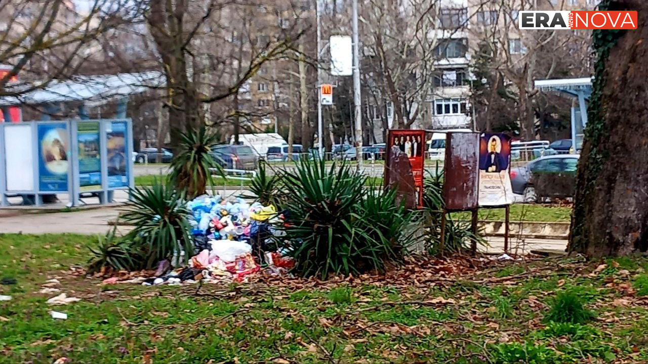 Една от най-използваните автобусни спирки в Бургас, намираща се до болницата от страната на комплекс „Славейков“, е превърната в импровизирано сметище. Пространството зад спирката е засипано с изхвърлени пластмасови бутилки, найлонови торбички и различни битови отпадъци, които се трупат от седмици. Читатели на ЕраНова изпратиха снимков материал, който документира състоянието и показва, че бетонните саксии в района често се използват вместо кошчета за боклук. В изпратените кадри се вижда, че отпадъците са разположени както зад пейките, така и върху тротоара, което затруднява преминаването на пешеходците.